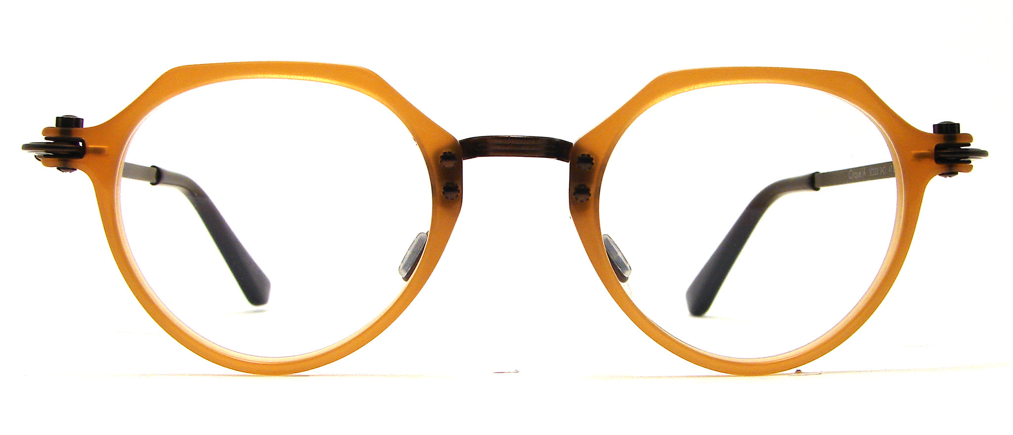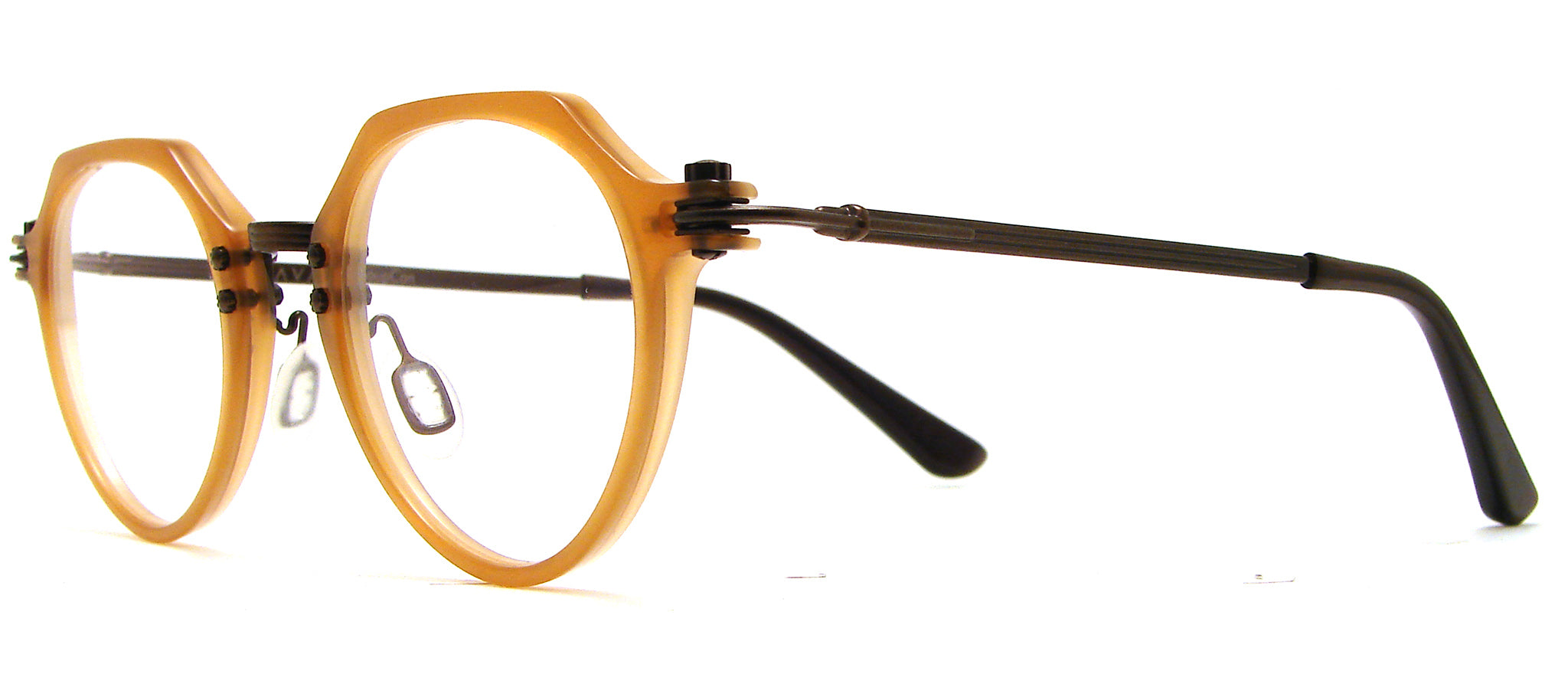 The "Cinque" model by Tavat, this one in sand (amber) acetate with dark copper colored stainless steel temples.