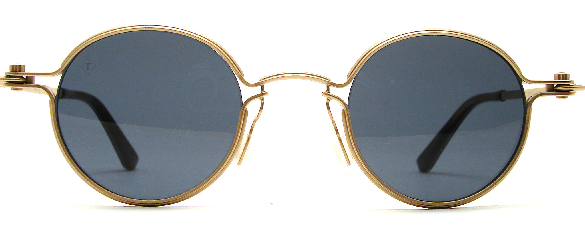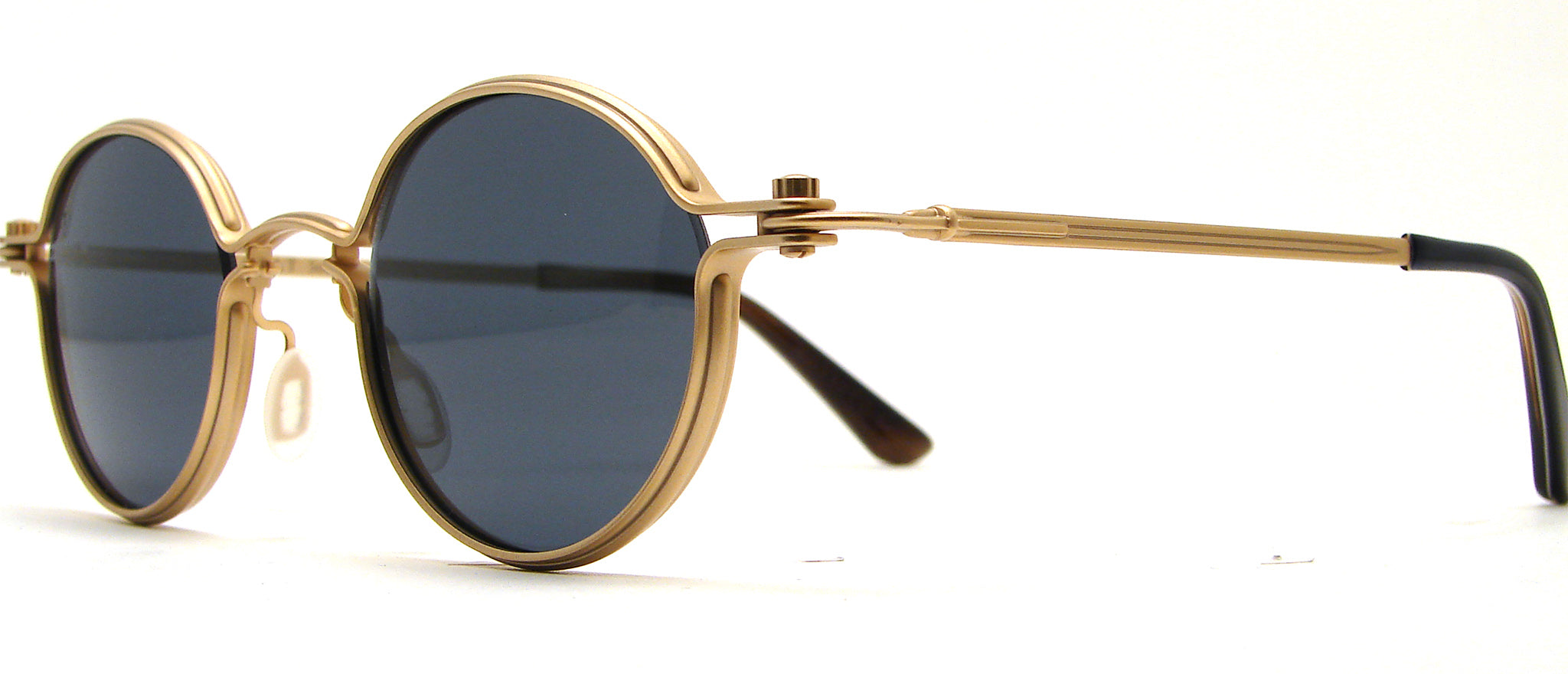 The "Orb" model by Tavat, this one in pale gold stainless steel. Sun lenses are blue grey.