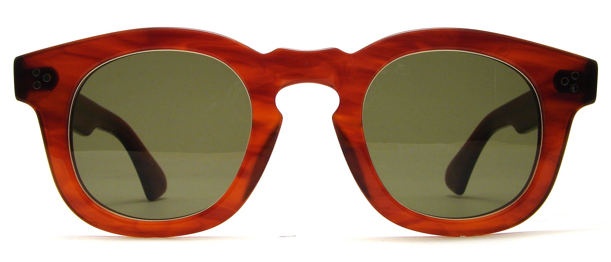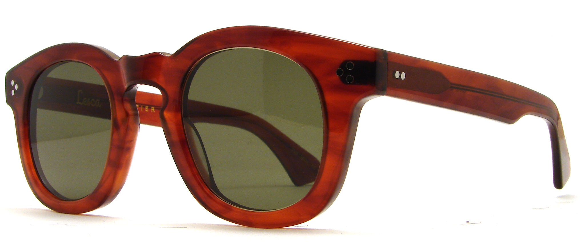 A thick and chunky design by Lesca. A nice large unisex frame. Frame color is amber patterned, with green sun lenses.