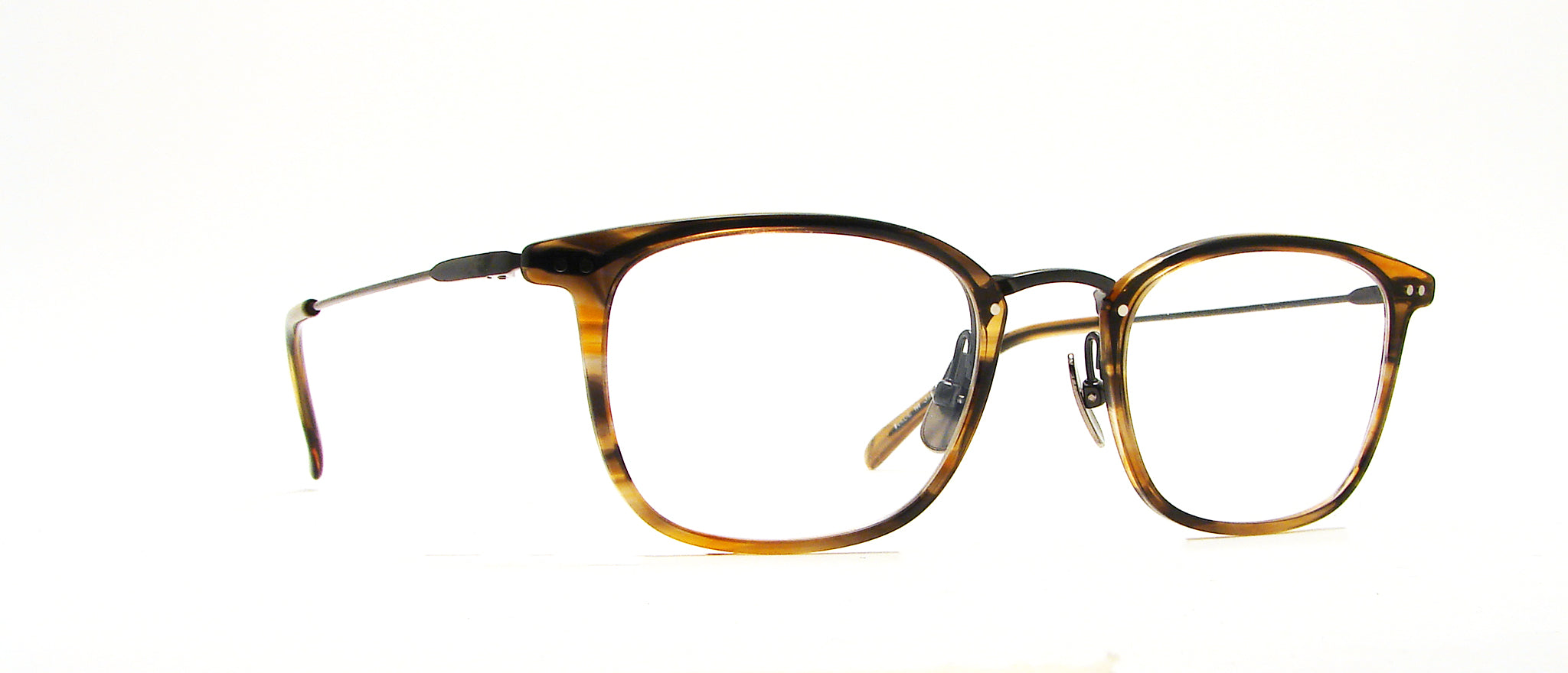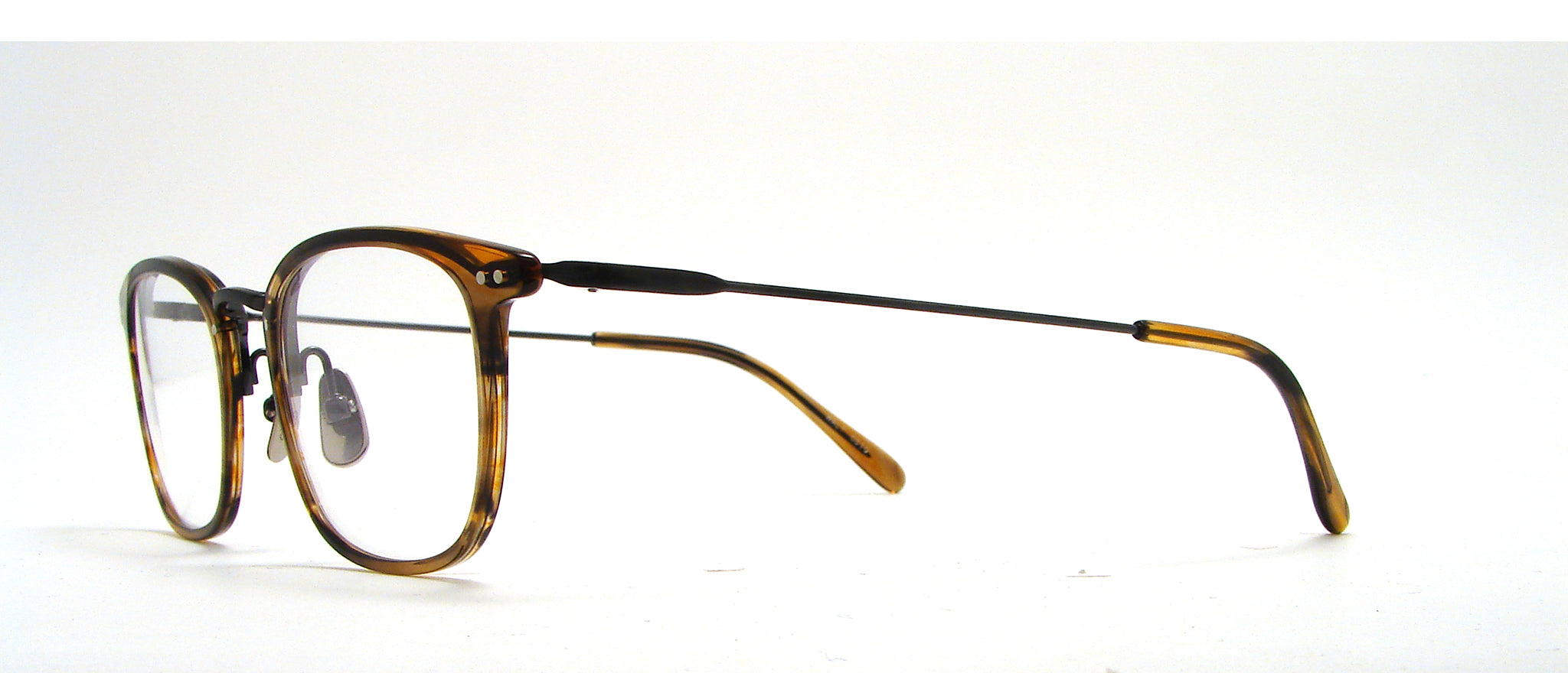 The "Walt" model by Yellows Plus. A simple shape combining titanium and acetate. suitable for a man with a larger head. Frame color is olive yellow pattern with black.